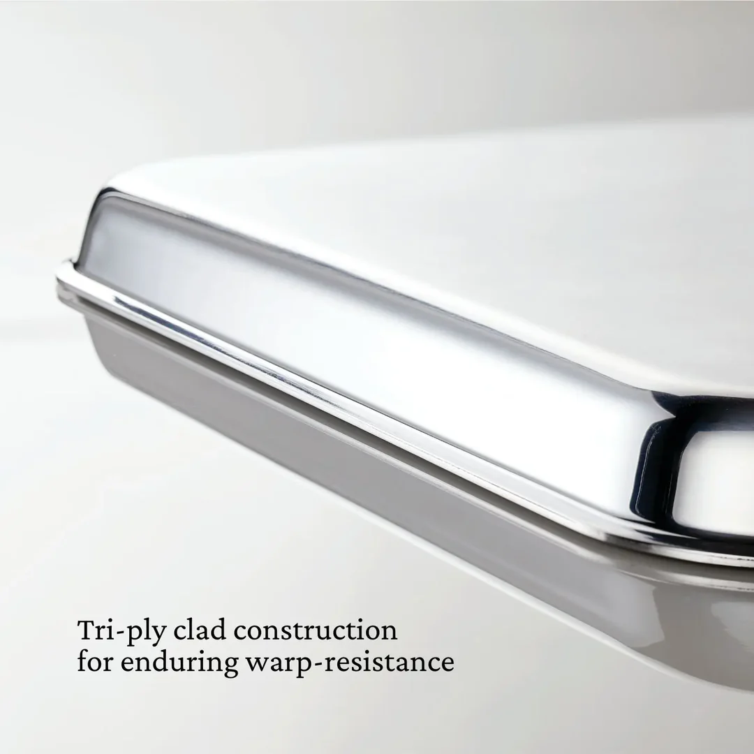 - WARP-RESISTANT - Tri-ply clad stainless steel sheet pan is thermal tested and engineered to be warp-resistant, maintaining it's shape for a lifetime of oven baking and roasting