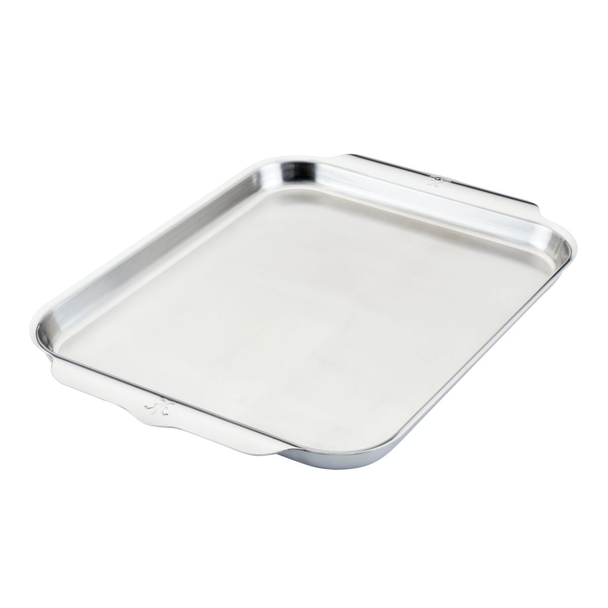 Warp-resistant clad roasting sheet pan features wide curved handles, providing an easily accessible, firm hold when removing from the oven, even when wearing oven mitts. Brushed stainless steel interiors and polished exteriors give this pan a lasting aesthetic that keeps it looking newer, longer, as does the dishwasher safe capability. This gourmet sheet pan is grill safe and oven safe to 600°F/316°C to accommodate a wide range of recipes.